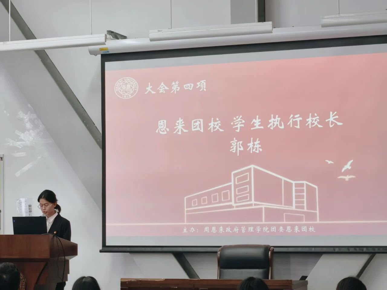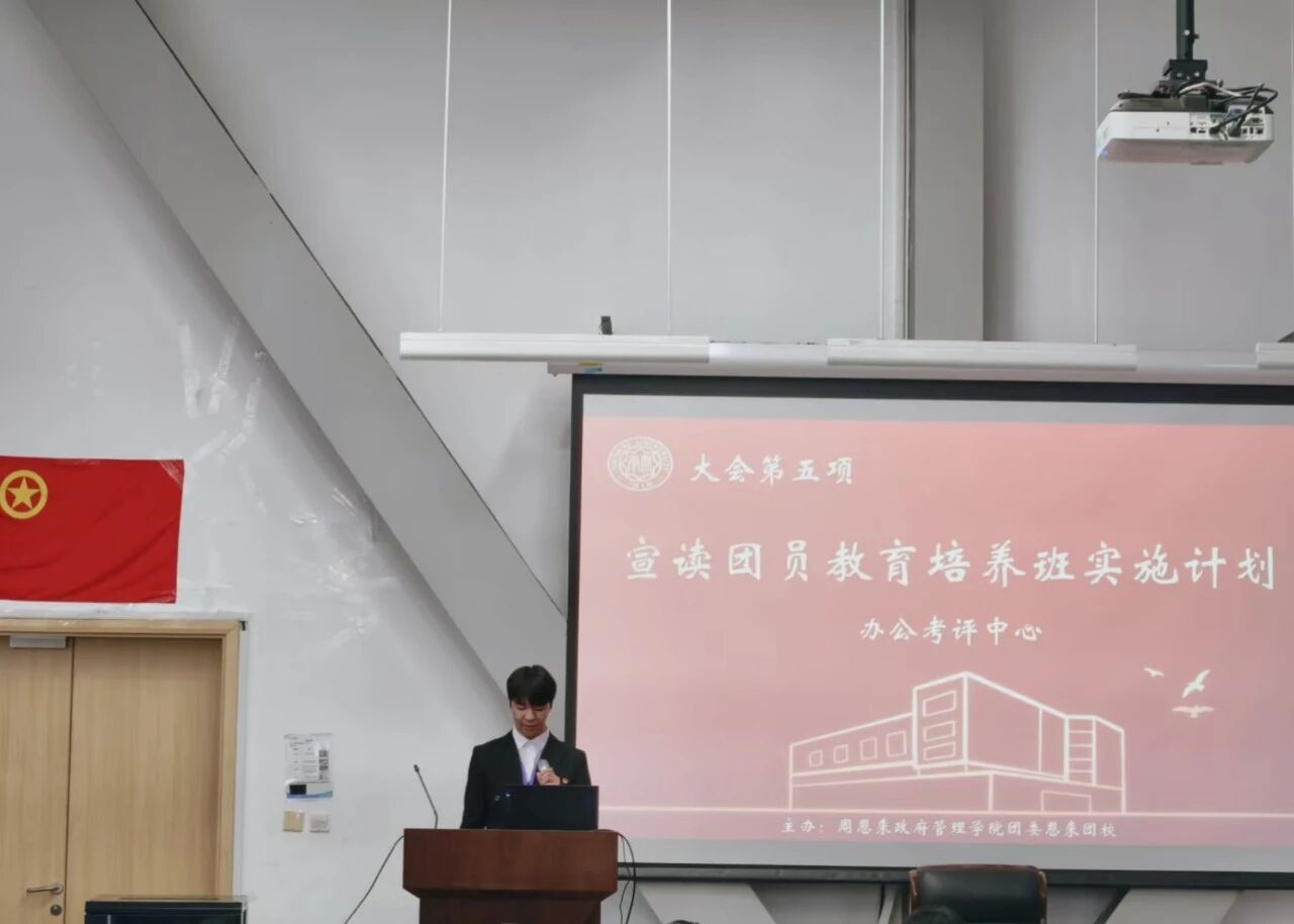 郭栋同学首先代表恩来团校全体成员对各位学员的到来表示热烈欢迎,并阐述了恩来团校在深化团员党团使命认识,培养素质全面、能力突出的优秀团员方面的重要作用。此外,郭栋同学从理论储备、实践行动和个人素养三个方面对全体学员提出了期望,希望学员们能够在恩来团校学有所获、思有所悟、行有所成!