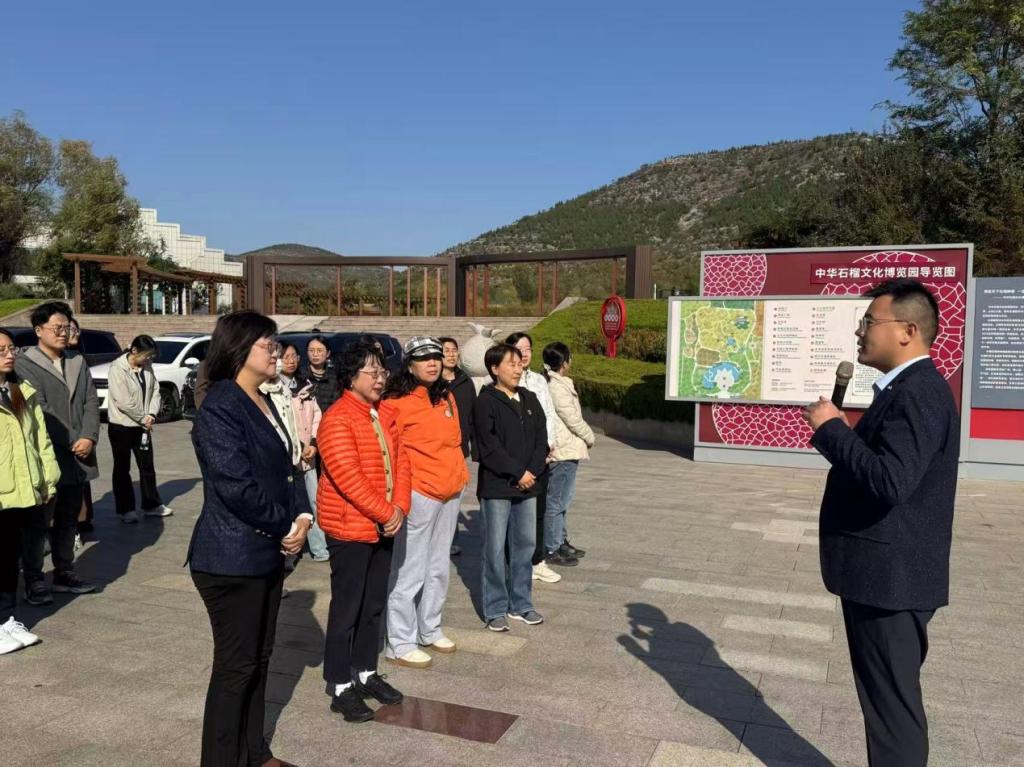 活动次日,师生们走进中华石榴文化博览园。园区坐落于枣庄“冠世榴园”核心地带,因习近平总书记曾亲临考察而意义非凡——总书记的殷切嘱托为园区发展注入了强大动力,也让这里成为体悟民生关怀、践行乡村振兴战略的生动课堂。讲解员介绍,石榴不仅是当地的特色支柱产业,更被赋予深厚的象征意义:“火红的石榴花象征蓬勃向上的生命力,饱满的石榴籽则呼应‘各民族像石榴籽一样紧紧抱在一起’的民族团结理念。”师生们一边参观石榴标准化种植基地与产业展示区,一边聆听园区“以红色底蕴赋能特色产业、带动村民增收致富”的故事,深刻领会“乡村振兴既要富口袋,也要富精神”的内涵。